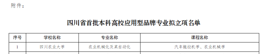 根据《四川省教育厅关于开展首批本科高校应用型品牌专业建设工作的通知》(川教函〔2023〕285号)精神,四川省教育厅组织了四川省首批本科高校应用型品牌专业申报工作。经专家通讯评审、会议评审和厅长办公会审议等程序,公司的农业机械化及其自动化专业与四川川龙拖拉机制造有限公司、吉峰农机(成都)有限公司、德阳市金兴农机制造有限责任公司联合申报的四川省首批本科高校应用型品牌专业获批立项公示。