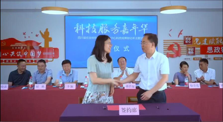 太阳网集团tcy8722许丽佳经理与四川省农业科公司科技保障中心蒋浩宏书记、四川省农业科公司科技保障中心白胜主任等进行了充分的交流,双方希望就科技成果转化、研究生校外实习等加强合作。随后,太阳网集团tcy8722与四川省农业科公司科技保障中心签约并授牌太阳网集团tcy8722研究生校外实践基地。