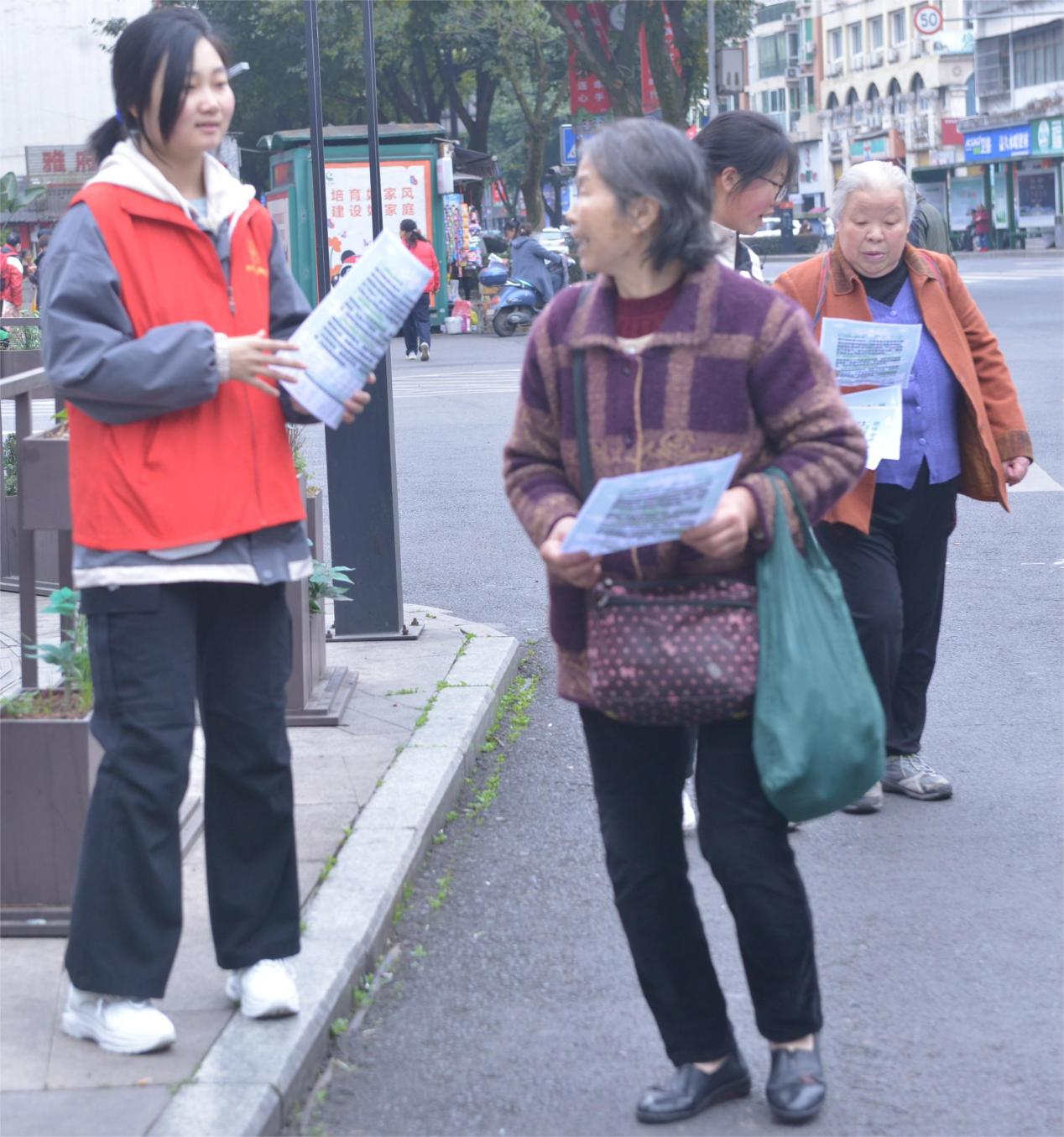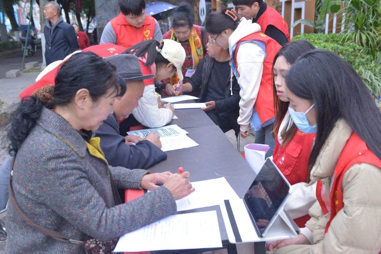 (图为志愿者向老年居民宣传安全知识 摄/黎丁铭)
