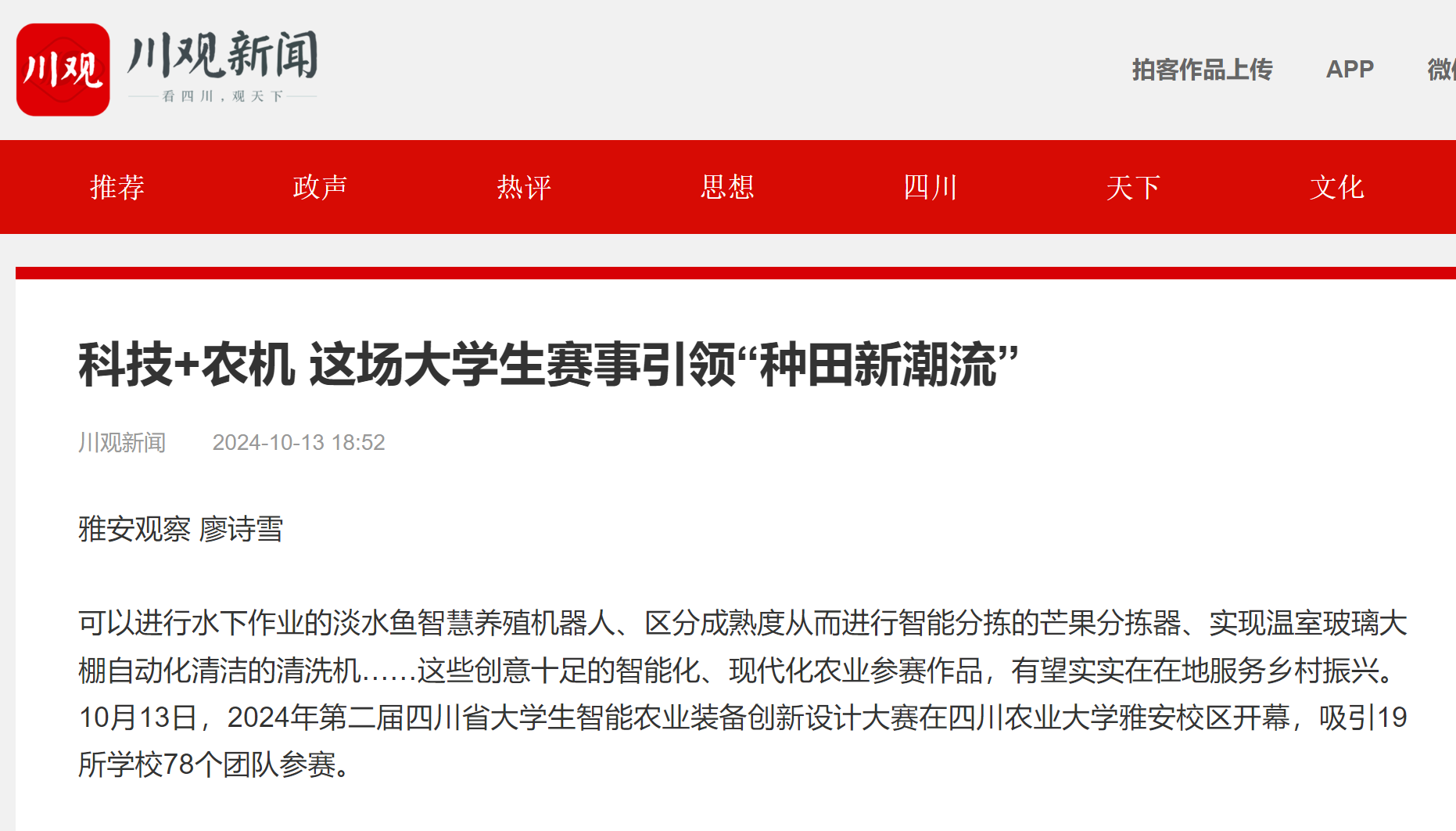 可以进行水下作业的淡水鱼智慧养殖机器人、区分成熟度从而进行智能分拣的芒果分拣器、实现温室玻璃大棚自动化清洁的清洗机……这些创意十足的智能化、现代化农业参赛作品,有望实实在在地服务乡村振兴。10月13日,2024年第二届四川省老员工智能农业装备创新设计大赛在太阳网集团tcy8722雅安校区开幕,吸引19所公司78个团队参赛。