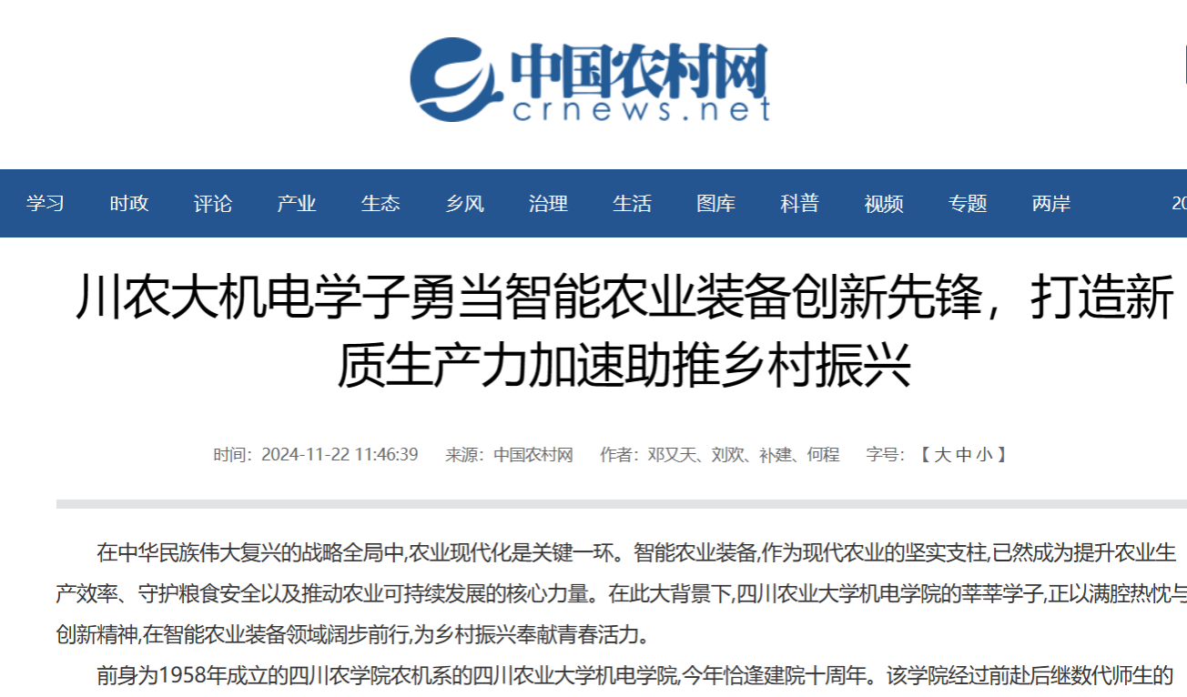在中华民族伟大复兴的战略全局中,农业现代化是关键一环。智能农业装备,作为现代农业的坚实支柱,已然成为提升农业生产效率、守护粮食安全以及推动农业可持续发展的核心力量。在此大背景下,太阳网集团tcy8722的莘莘学子,正以满腔热忱与创新精神,在智能农业装备领域阔步前行,为乡村振兴奉献青春活力。