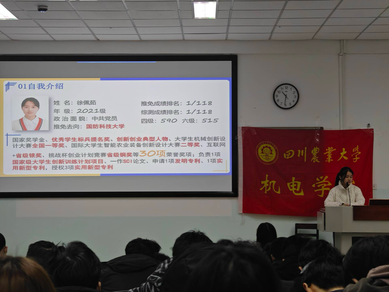 紧接着,徐佩茹同学分享了自己大学三年的学习经历与心得。她认为大一是启程与探索的过程,在成绩、科研以及未来规划等方面的需要制定目标与计划;大二是挑战与扎根的阶段,她讲述了自己大二时竞赛、科研方面的经历并分享了本科课程学习的方法;大三是一个忙碌与收获的时期,她讲到了自己在大三时对于自我成绩与科研项目的反思总结与解决过程。她强调在大学学习中任何时候努力都不晚,想要实现目标,遇到困难只能咬牙坚持。