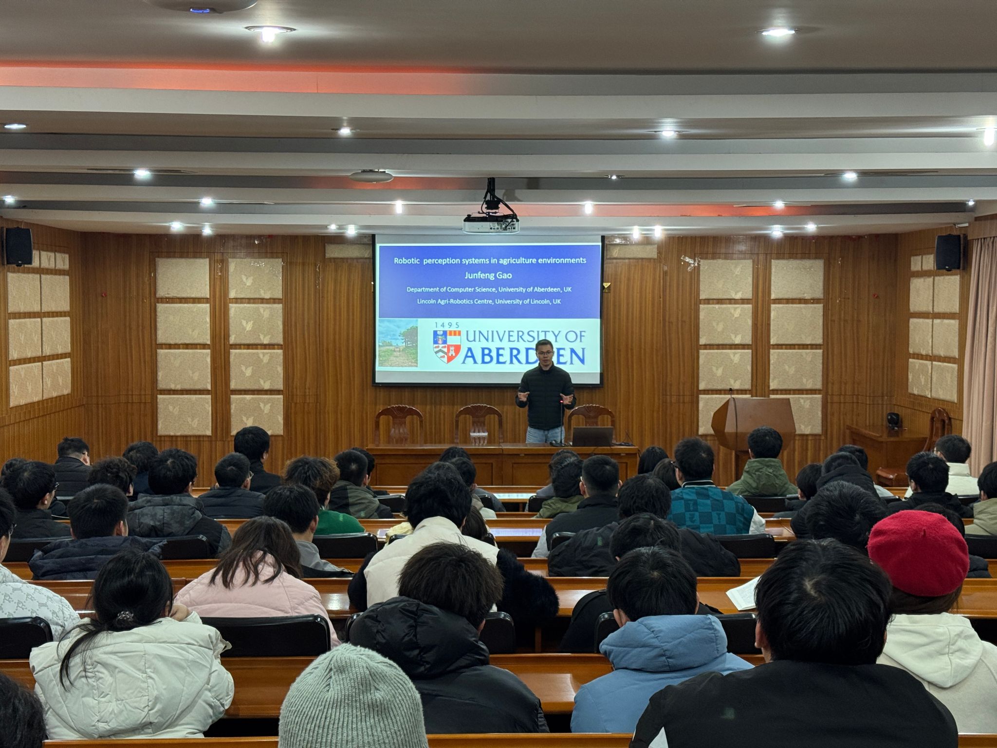 2025年12月16日,公司优秀员工、英国阿伯丁大学长聘教职助理教授、博士生导师高俊峰回到母校,在逸夫楼二楼报告厅作题为“面向复杂农业环境的机器人感知系统”的专题讲座。讲座由太阳网集团tcy8722副经理张黎骅教授主持,公司师生代表80余人参加了此次讲座。