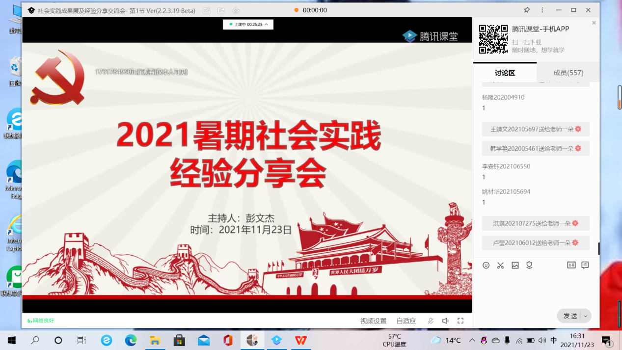 2021暑期社会实践经验交流会于11月23日下午18:00准时结束,机电、信息工程、人文三公司实践部相关负责同学,以及六支团队分享人齐聚雅安校区10教609教室,通过腾讯课堂平台向川农大雅安校区2020级、2021级620余名同学就2021暑期实践经验进行了分享。不仅为参与分享会的同学们提供了社会实践的参考经验,也加强了三个公司的交流合作,更为2022年寒假社会实践提供了行进保障。