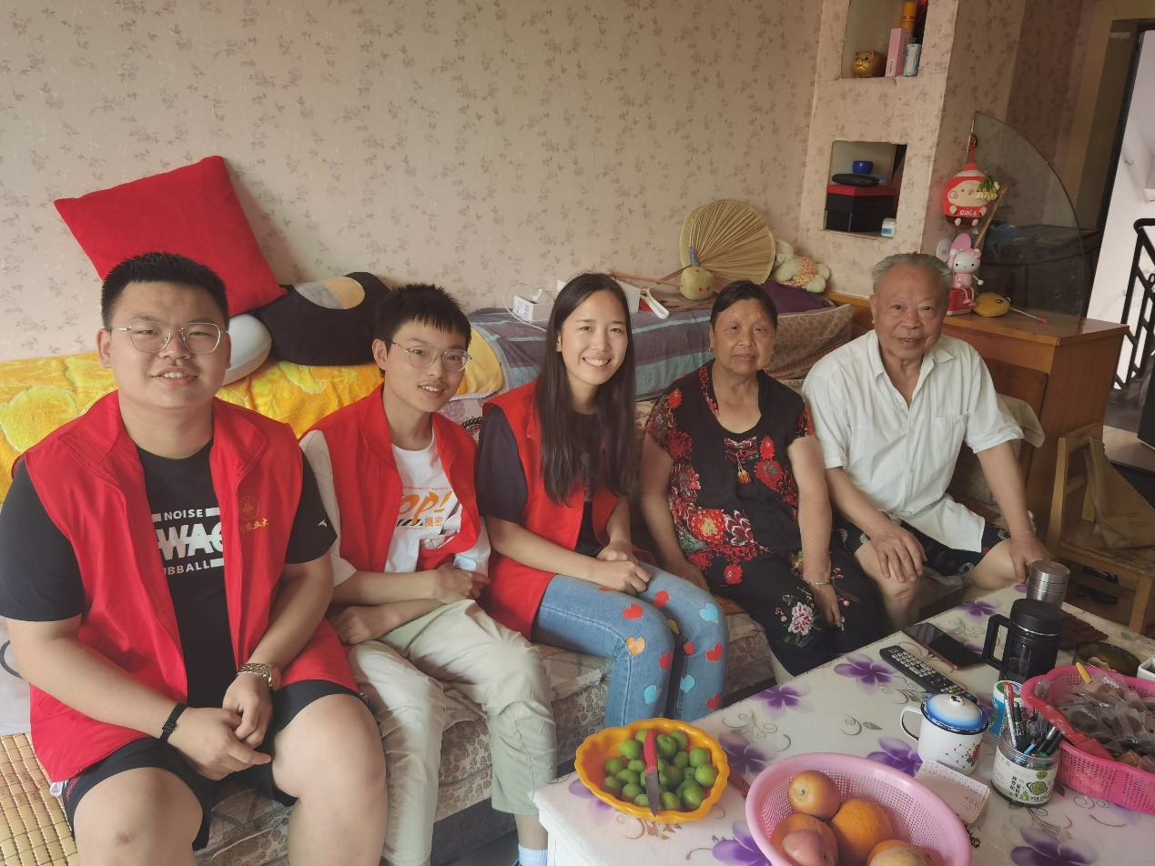 在走访到某户人家时,开门的老人热情邀请志愿者进去坐坐,进入家门老人说自己是一名老党员,想和志愿者们多聊聊天。于是,四少一老围坐在客厅,开始了热烈地交流,包括家乡文化、嘘寒问暖、疫情形势等方面,在聊到历史问题时,老党员侃侃而谈,给志愿者讲了许多年轻时的故事,以及党员道路上的经历,并对志愿公益表达了高度的赞美。老人提出家里灯泡闪烁昏暗,志愿者结合专业知识迅速解决了问题,受到了老人的感谢。