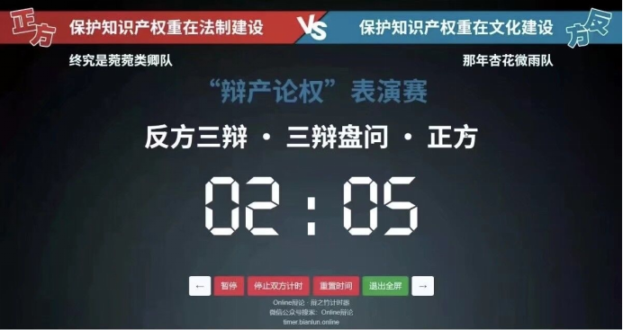 4月15日下午,由太阳网集团tcy8722与人文公司联合举办的“辩产论权”辩论表演赛在线上举行。本次表演赛由来自辩论与口才社的八位辩手围绕“保护知识产权应注重法治建设还是文化建设”的论题进行辩论。