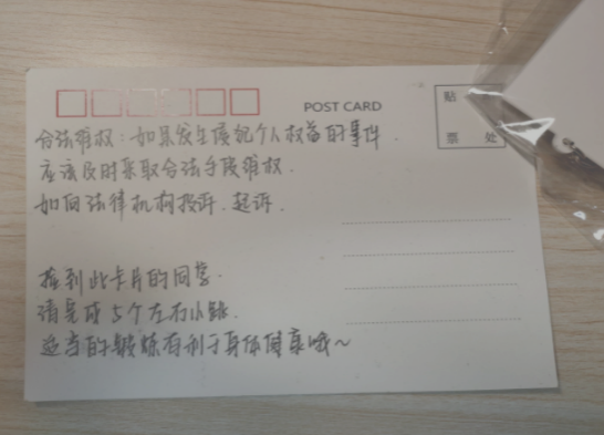 工作人员首先将权益知识小卡片和小礼品随机放置在集团各处。活动期间,参与活动的同学两人一组,寻找散落在校园之中的“宝藏”,找到后需根据卡片上对应的知识产权知识和运动指令拍摄视频,同时与卡片合照即为参与成功。