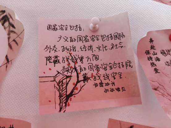 线下活动现场,权益部同学早早去布置好留言墙,等待同学们到来。参加活动的同学在留言墙处围绕国家安全主题书写下自身想法,积极为维护国家安全建言献策。