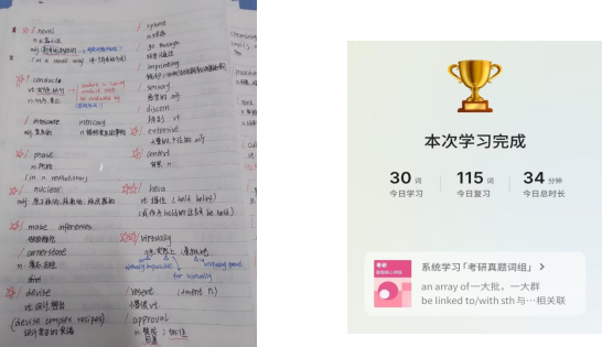 “千词百练”单词打卡活动中,同学们不仅在线上各个软件如奶酪单词、百词斩、有道翻译等单词库进行学习,而且在线下通过单词书、词典等进行单词背诵。在完成一天的单词量后,大家将今天所学提交到对应的打卡相册进行记录,有效地帮助同学们回顾复习所学单词并加深对单词的记忆。通过21天的打卡挑战,大部分同学的单词量有了显著提升,自律性和学习动力也得到了极大增强。