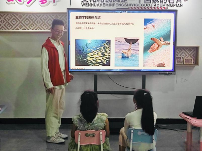 在“生物学的应用”环节,志愿者向孩子们讲述了陈薇院士团队研发新冠疫苗的“中国速度”、袁隆平院士培育杂交水稻的“稻田奇迹”,以及众多科学家在生物学领域的奋斗故事。孩子们深受鼓舞,纷纷表示:“长大后也想成为这样的科学家!”