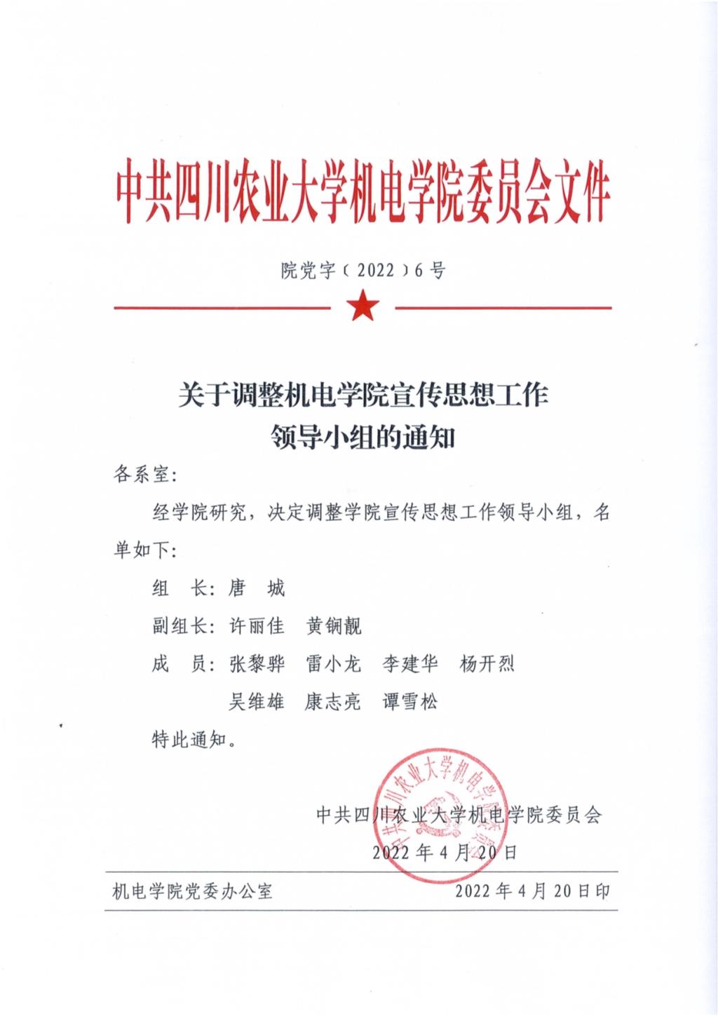 公司党字[2022]6号-关于调整太阳网集团tcy8722宣传思想工作领导小组的通知