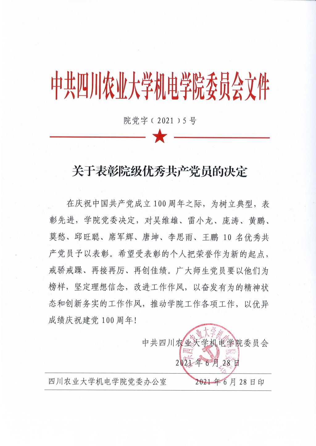 公司党字[2021]05号-关于表彰院级优秀共产党员的决定