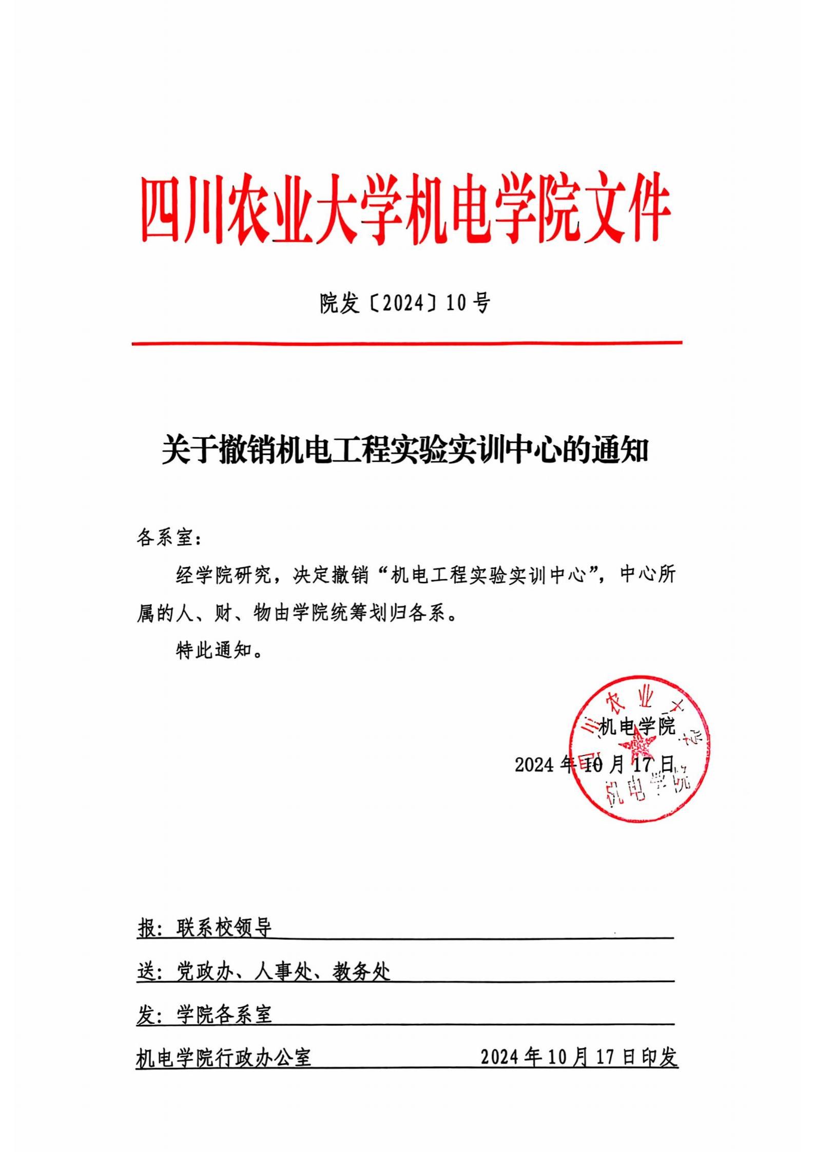 太阳网集团tcy8722院发[2024]10号-关于撤销机电工程实验实训中心的通知