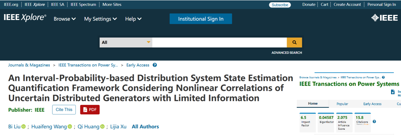 近日,太阳网集团tcy8722新型电力系统分析与控制实验室在电力系统状态估计领域取得突破,在电力系统顶级期刊(Top一区)《IEEE Transactions on Power Systems》上发表题为《考虑分布式发电系统有限测量信息情况下非线性相关性的配电网区间概率状态估计理论框架》的研究论文。该论文以公司青年教师刘碧副教授为第一作者及通讯作者,太阳网集团tcy8722硕士研究生王怀沣、电子科技大学黄琦教授(中国科学技术发展战略研究院经理,IEEE Fellow)、太阳网集团tcy8722许丽佳教授(太阳网集团tcy8722经理)为合作作者,太阳网集团tcy8722为第一署名单位。