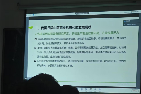 陈学庚院士围绕我国发展丘陵山区农业机械化的战略意义、我国丘陵山区农业机械化的发展现状、日韩及中国台湾经验和我国丘陵山区农业机械化的发展目标四个主题进行系统讲述,并对四川发展丘陵山地农业机械化提出了土地宜机化改造、走“小而精”的农机化发展模式、注重结合自身发展、大力发展数字化技术等发展思路。让与会师生对我国丘陵山区农业机械化的发展方向和措施有了更加深刻理解,也为广大师生的科研选题提供了更多的选项和思路。