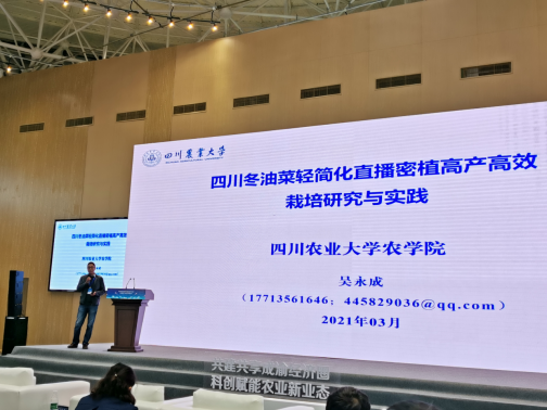 吴永成教授在论坛上作了题为《四川冬油菜轻简化直播密植高产高效栽培研究与实践》的报告,就四川油菜栽培面临的生产技术难题,提出了稻茬田直播油菜轻简高效栽培策略,展示了团队在四川开展油菜直播密植高产高效栽培技术示范等工作成效。